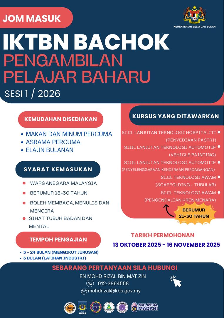 Berbekalkan modul moden, fasiliti terkini, serta bimbingan pakar, IKTBN Bachok menjadi pilihan utama belia yang ingin membina kerjaya berkemahiran tinggi.